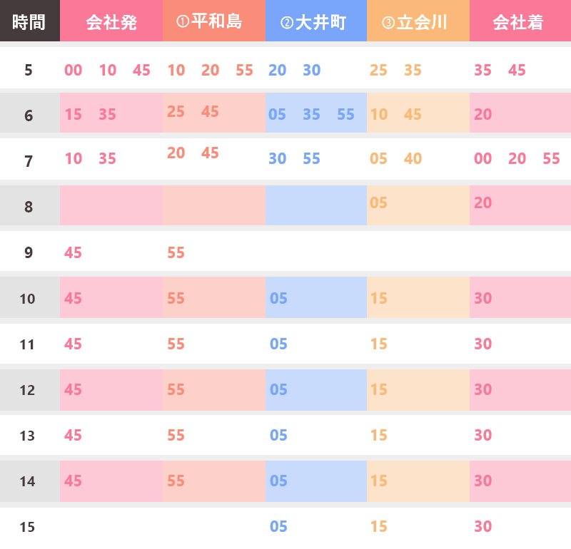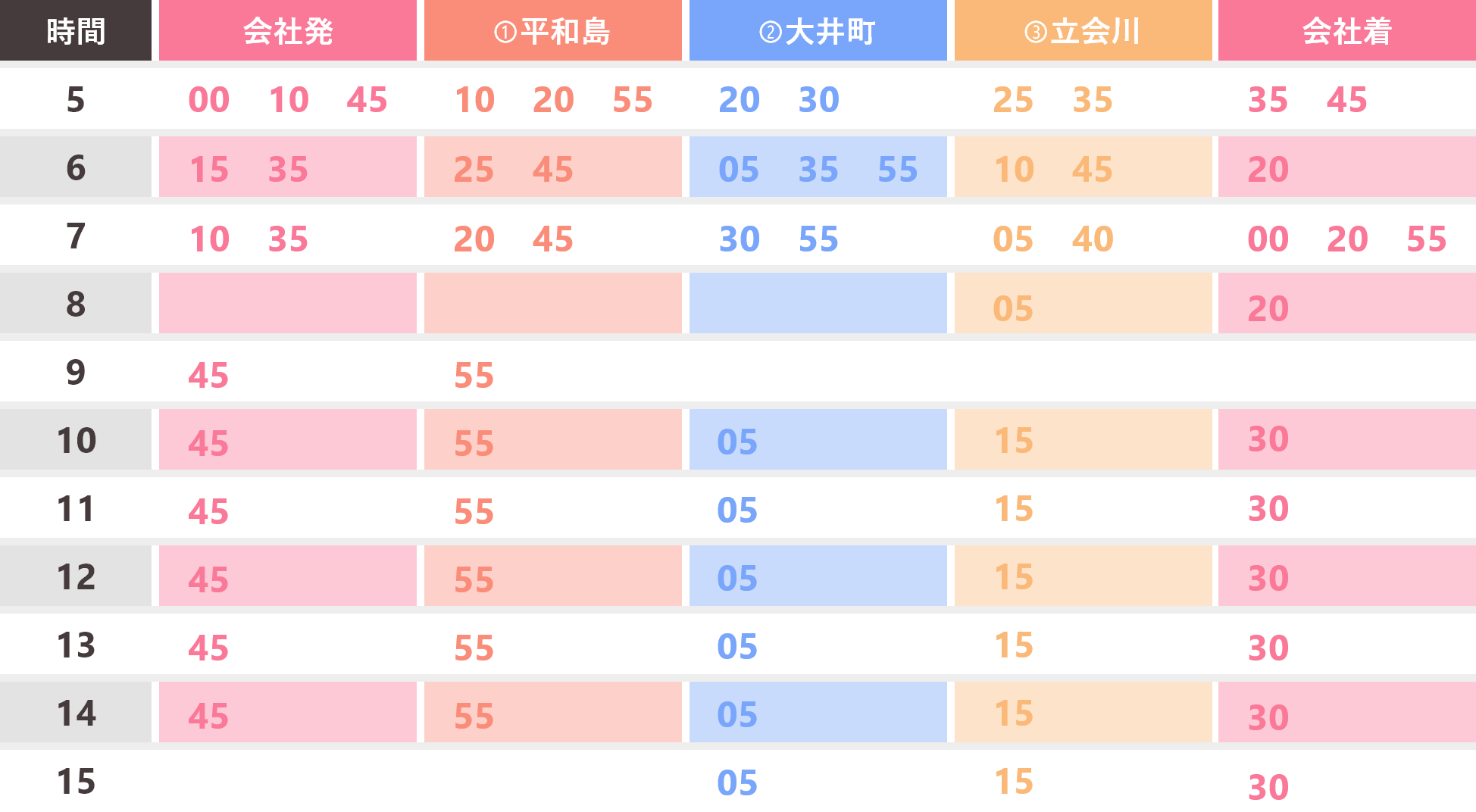 出勤も無料専用シャトルバスで駅から会社の真ん前までラクラクです! 公共のバスもありますが、羽田交通では点呼時間に合わせた無料シャトルバスを自社運行しています。 JRと京急線の合計4駅までダイレクトアクセス!仲間と楽しく話しながら、らくらく通勤。しかも交通費も出るから、金銭的な負担は実質0円です。